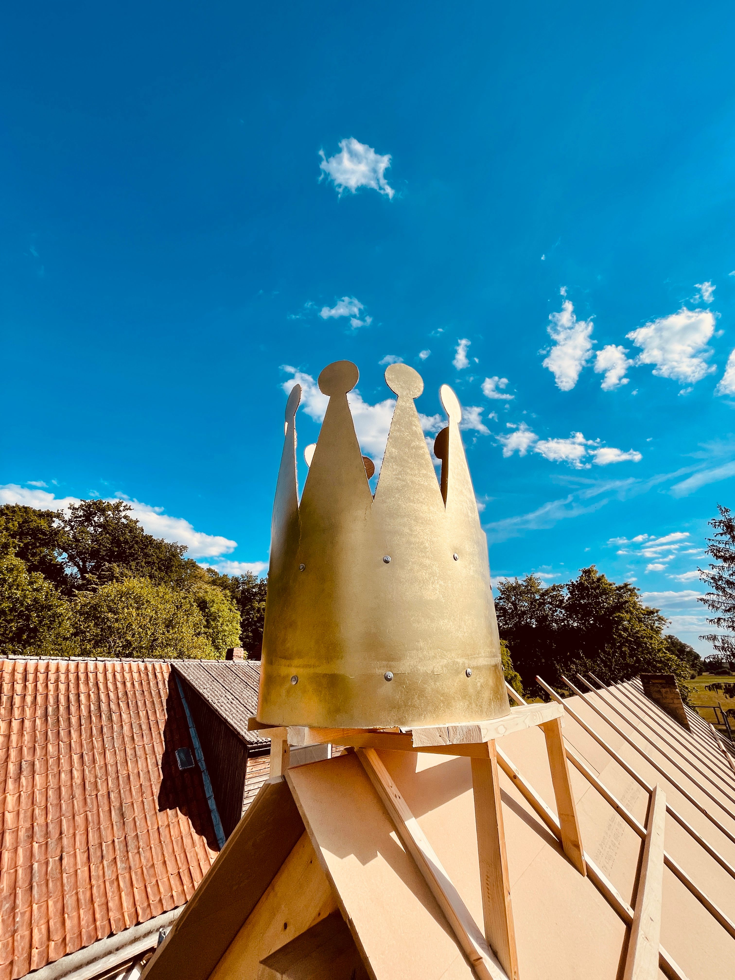 Das absolute Highlight thront jedoch auf dem Dachfirst: Auf speziellen Kundenwunsch haben wir eine große, goldene Krone als individuelles Zierelement montiert. Ein toller Beweis dafür, dass wir auch außergewöhnliche und kreative Ideen mit handwerklicher Präzision in die Tat umsetzen