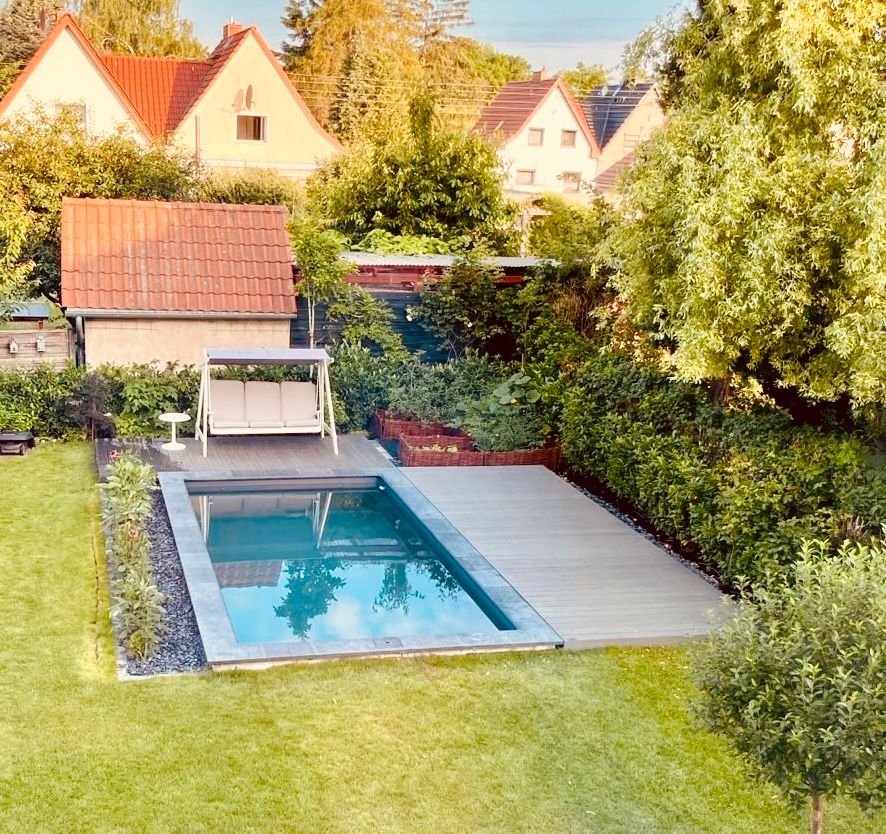 Ein Highlight ist die moderne Poolumrandung. Aus langlebigen WPC- oder beschichteten Dielen gefertigt, bildet sie eine fließende Verbindung zwischen dem Gartenpool und dem Haus. Die präzise Verlegung sorgt für eine saubere Optik, die gleichzeitig pflegeleicht ist. Ein erhöhtes Holzpodest schafft zudem eine gemütliche Sitzecke mit einer Hollywoodschaukel, ideal zum Entspannen.